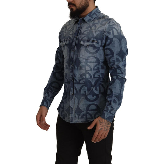 Dolce & Gabbana Blue Denim Stretch DG Logo Casual Mens Slim Shirt
